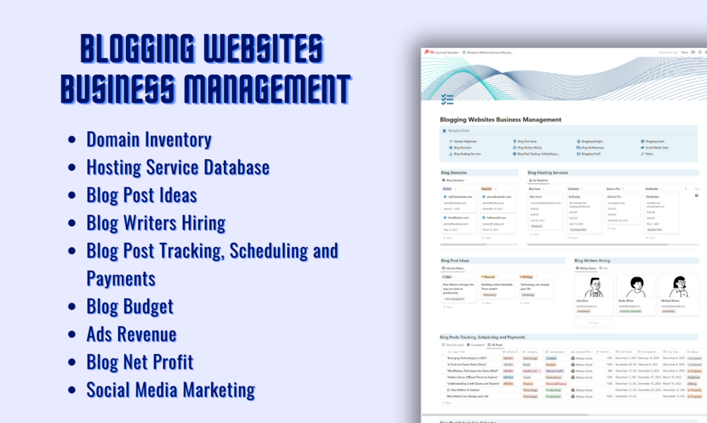 • Streamline your blogging business with organized content planning, scheduling, designing posts and revenue tracking.